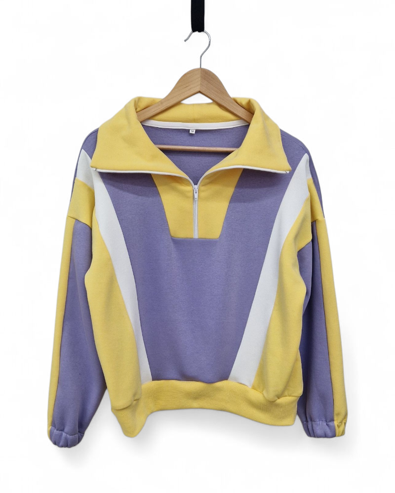 Dessuadora folgada amb coll gran i alt. Tancat amb cremallera. Baix acabat amb puny i màngues acabades en goma.