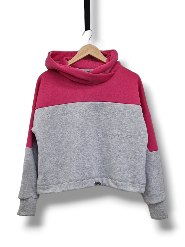 Dessuadora folgada amb caputxa i cordó al baix. Té la mateixa forma de davant que de darrera. Màniga acabada amb puny.