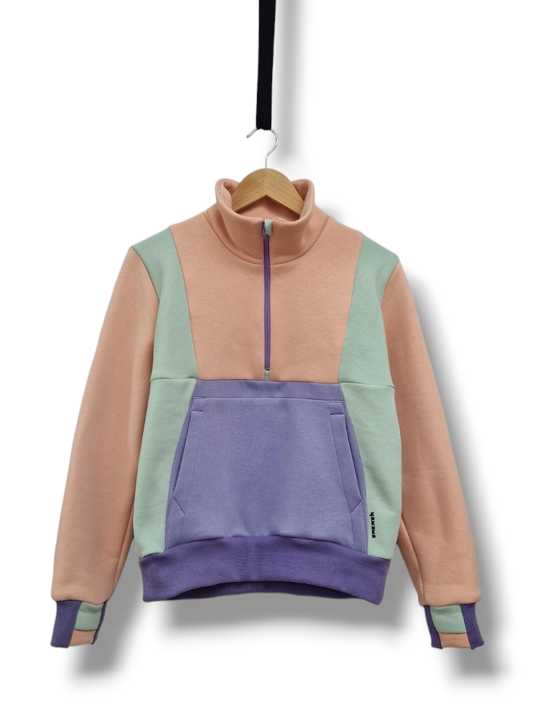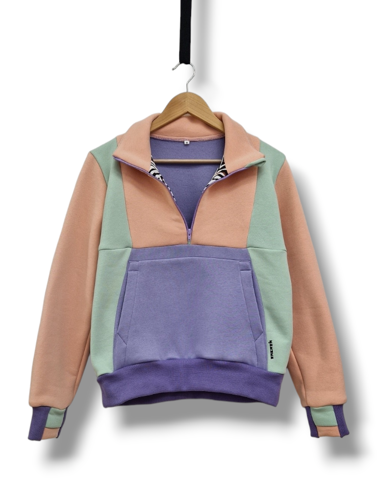 Dessuadora de forma recte. Consta d’una gran butxaca davantera. Coll alt amb obertura amb cremallera fins al pit.