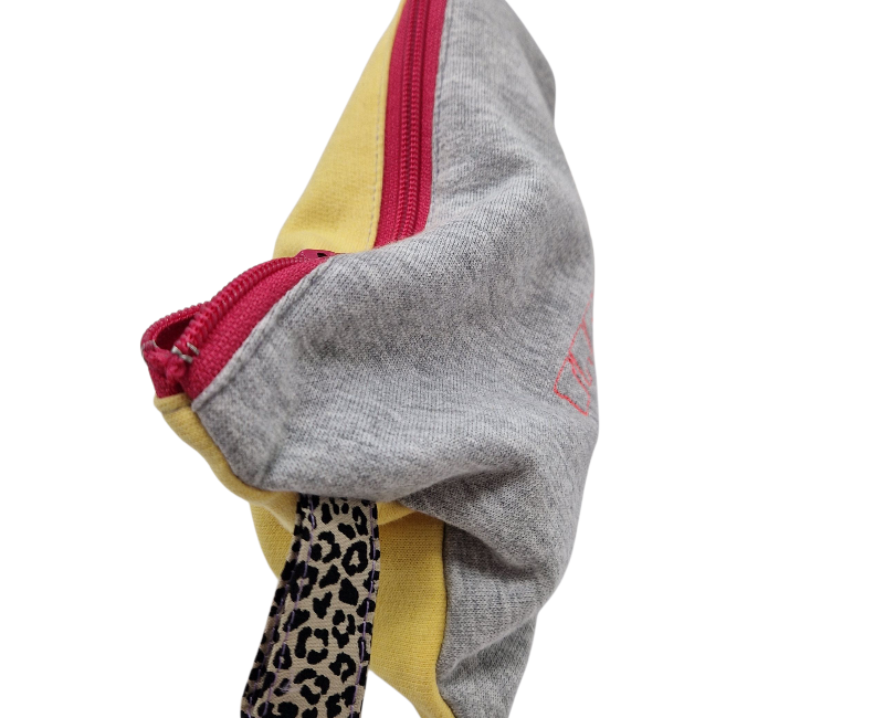 Los trozos que sobran al cortar nuestras sudaderas se transforman en monederos únicos y sostenibles. Forrados por dentro con tela vichy de rayas negras y con una práctica cinta lateral para que los puedas colgar donde quieras.