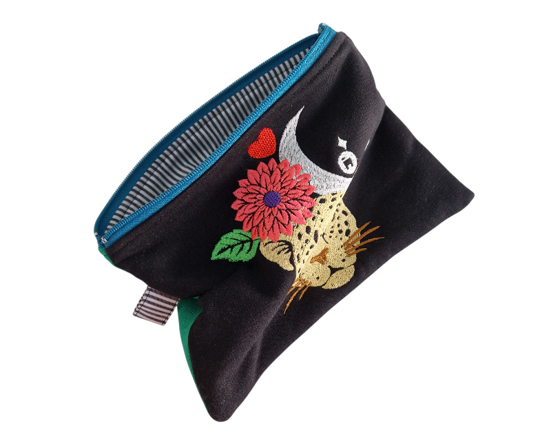 Los trozos que sobran al cortar nuestras sudaderas se transforman en monederos únicos y sostenibles. Forrados por dentro con tela vichy de rayas negras y con una práctica cinta lateral para que los puedas colgar donde quieras.