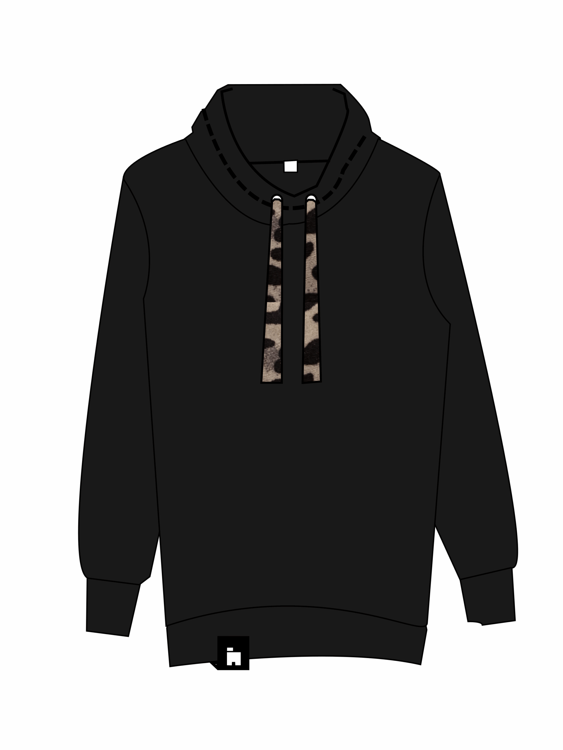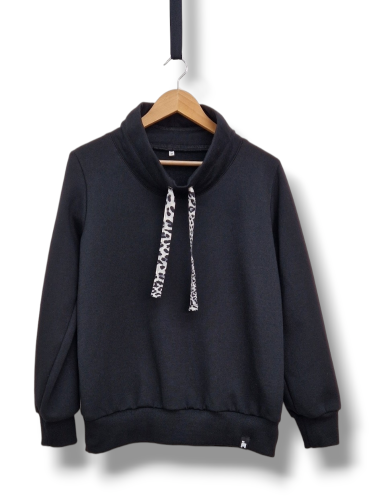Jersei amb sisa. Consta d’un coll alt ample amb ullals i cinta estampada. Tallatge llarg i acabat amb punys.