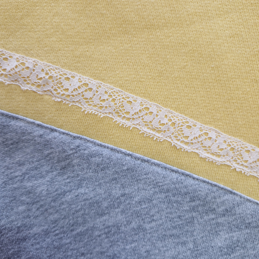 El tejido general es de sudadera felpada 50% poliéster y 50% algodón. Los puños son 48% poliéster, 48% algodón y 4% lycra.