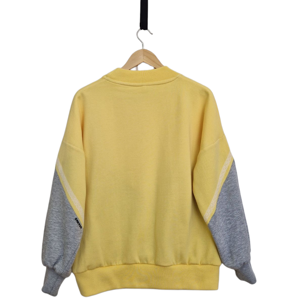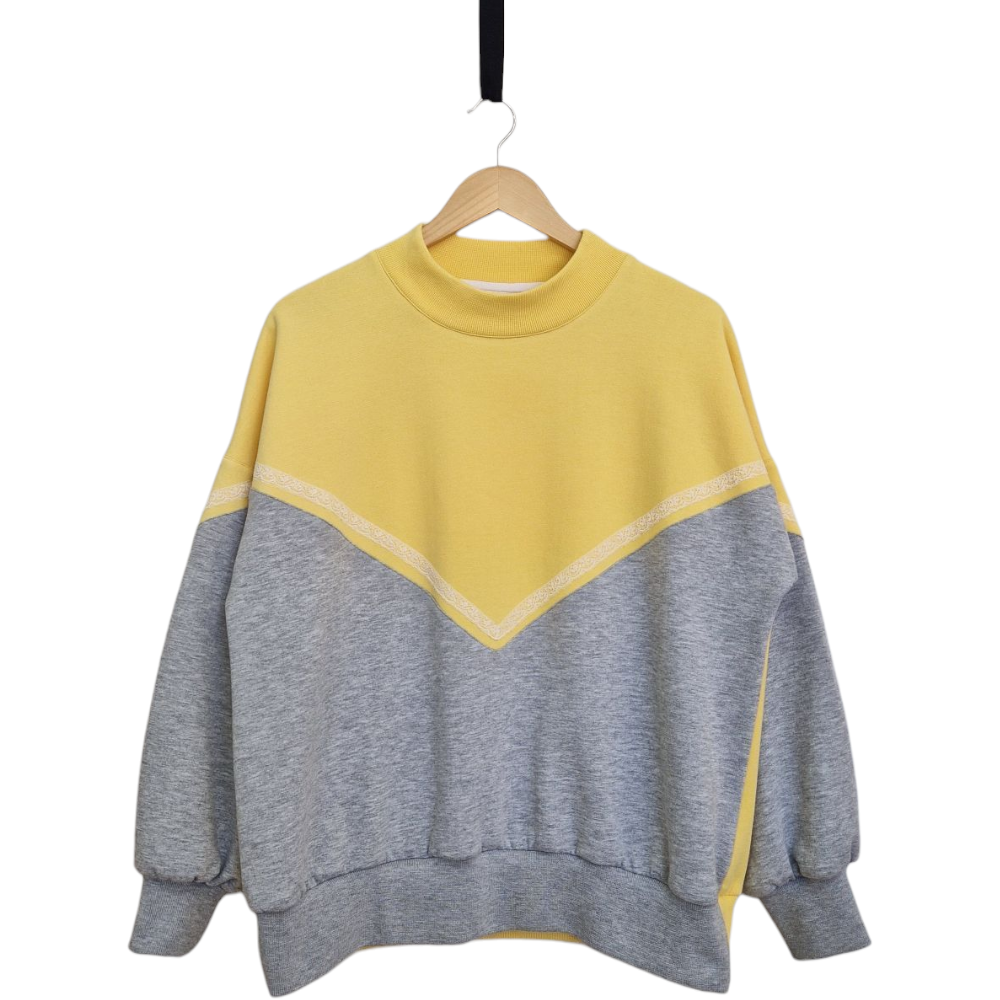 Jersei de silueta folgada amb muscles caiguts que proporciona un caient relaxat i còmode. El coll és rodó i presenta un acabat en canalé lleugerament alt, aportant estructura al disseny. Destaca un detall gràfic en forma de delta invertit al centre davanter, que s’estén de manera contínua cap a la part posterior de les mànigues, generant un efecte visual dinàmic. Les  mànigues amples de la part inferior, acabades amb punys de canalè igual que el baix de la peça.