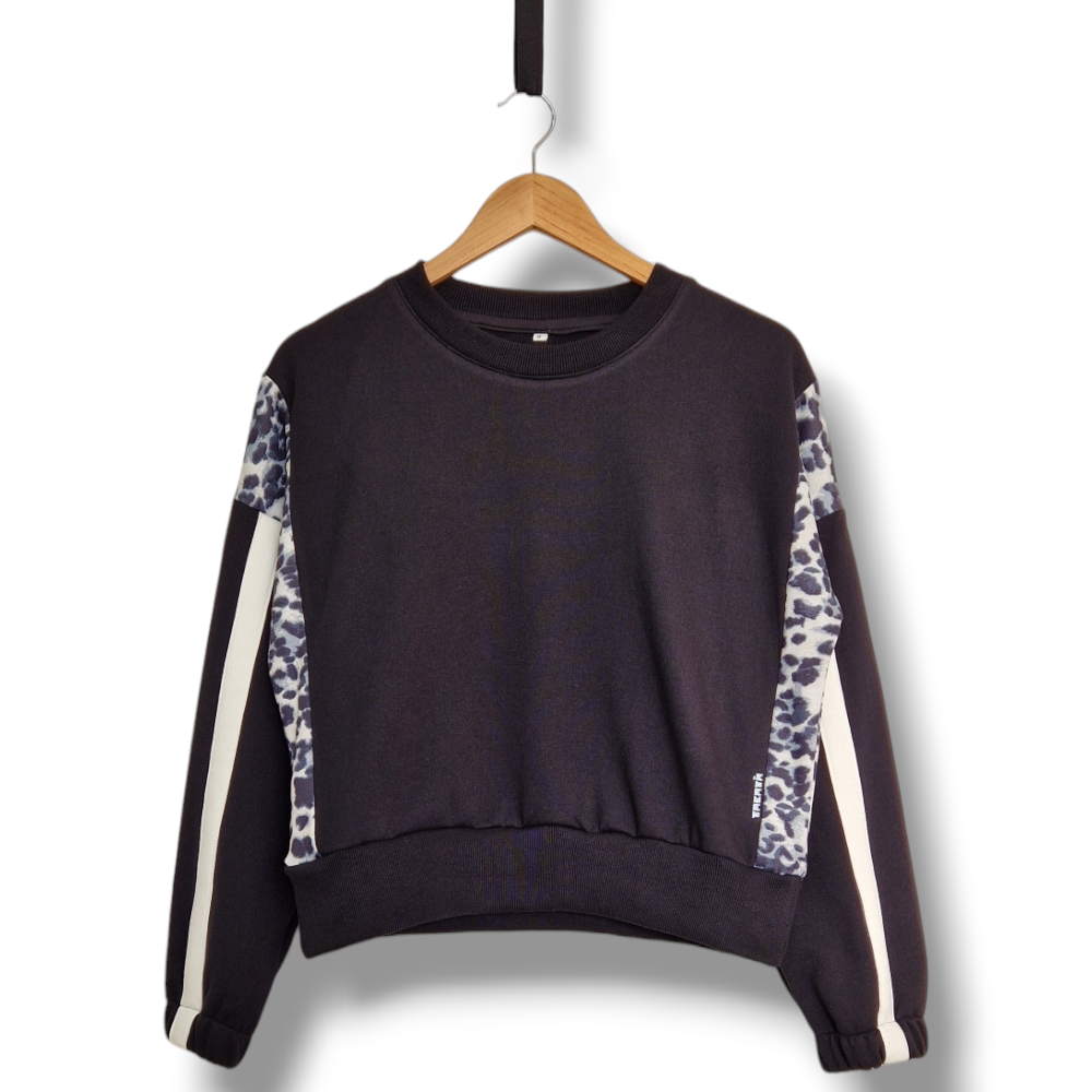 Jersey holgado con hombro caído. El bajo de la manga acabado con goma. El resto acabado con puños.