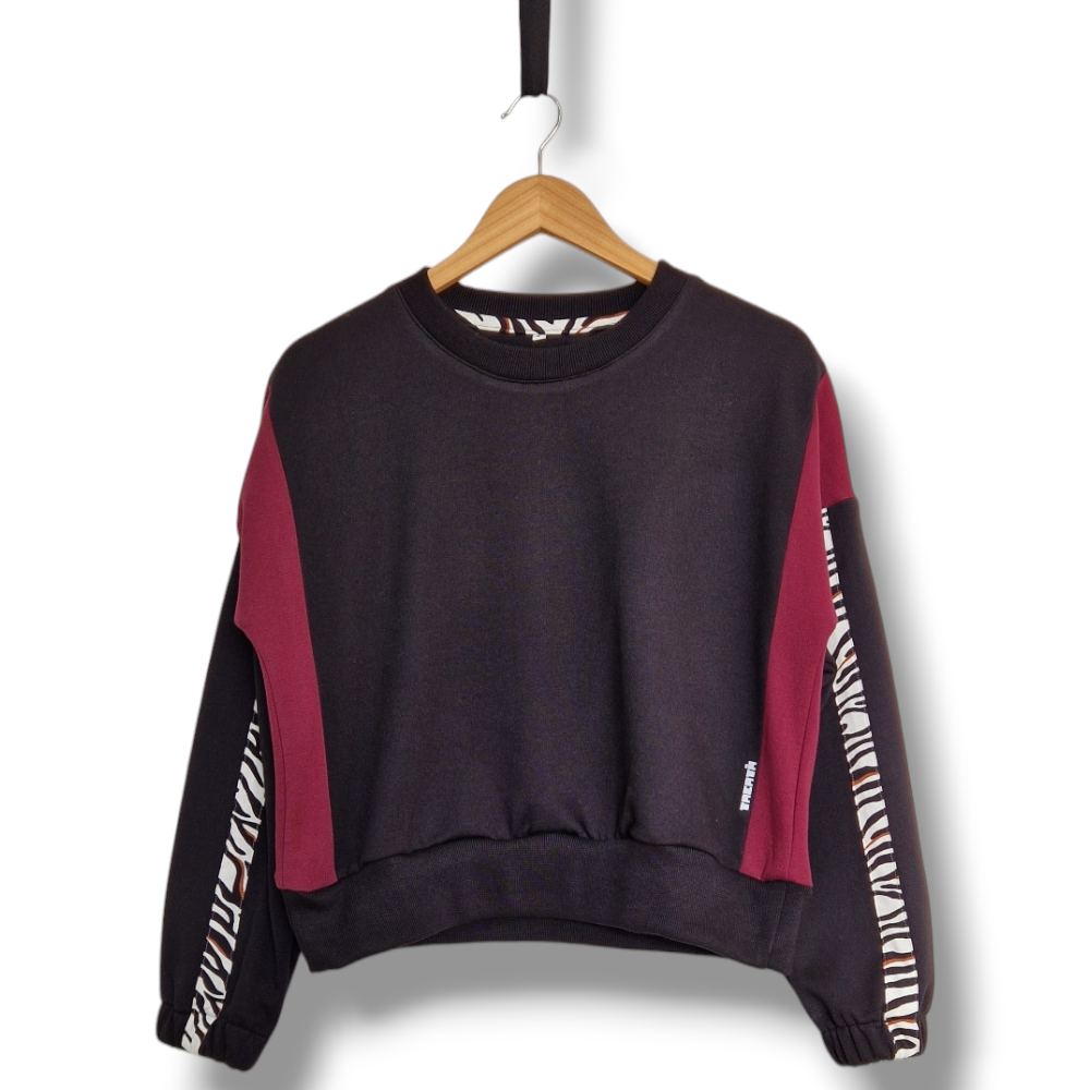 Jersey holgado con hombro caído. El bajo de la manga acabado con goma. El resto acabado con puños.